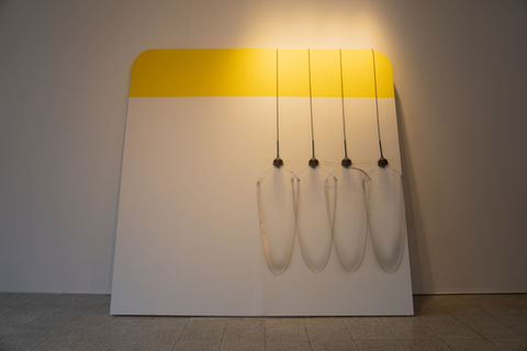 《無處安放的日常操演》,趕蠅機、鍍鎳圓珠鍊、木頭,244×244×20 cm,2022